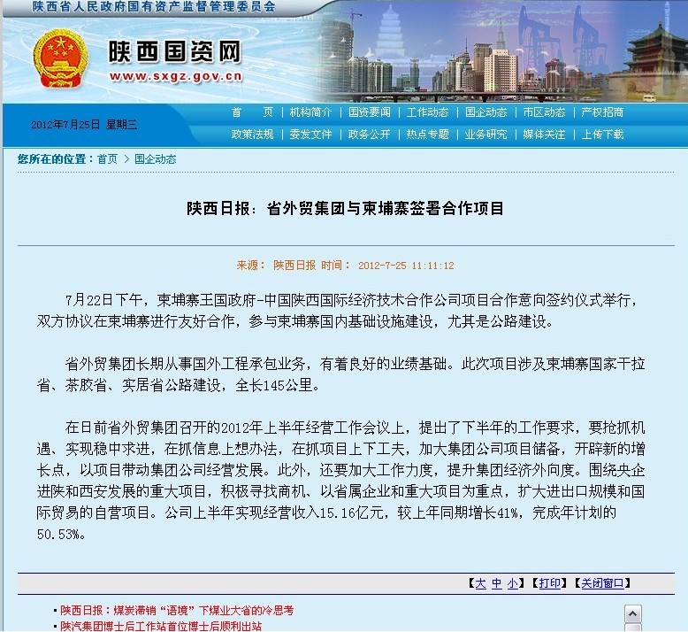 省國資委網站登載:陜西日報刊登省外經貿集團與柬埔寨簽署合作項目