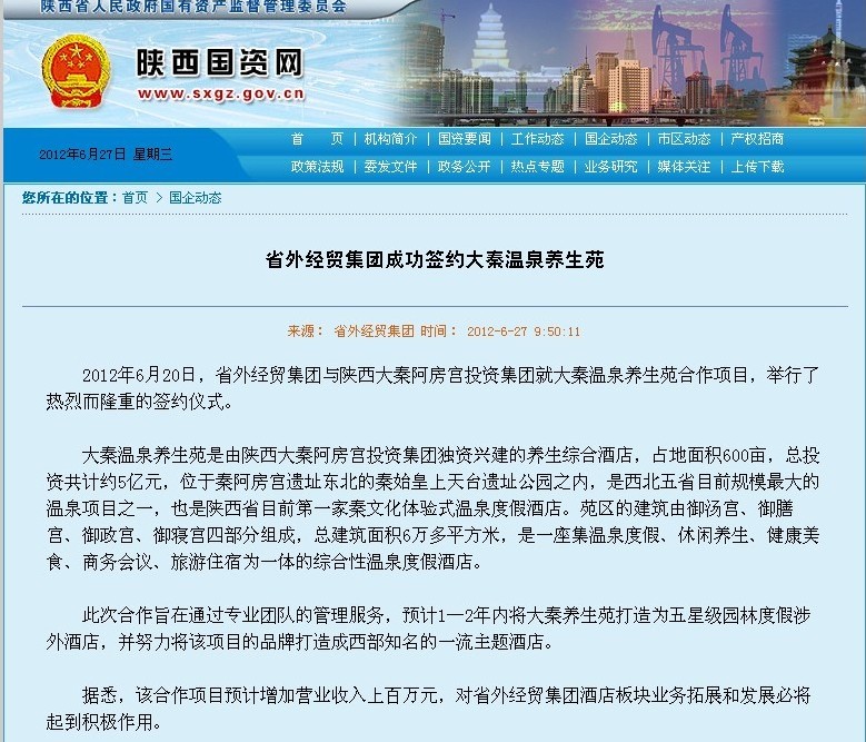 省國資委網(wǎng)站登載:省外經(jīng)貿(mào)集團成功簽約大秦溫泉養(yǎng)生苑