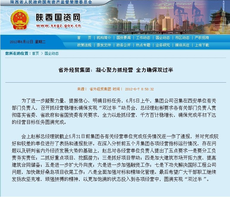 省國資委網(wǎng)站登載:省外經(jīng)貿(mào)集團(tuán)凝心聚力抓經(jīng)營 全力確保雙過半