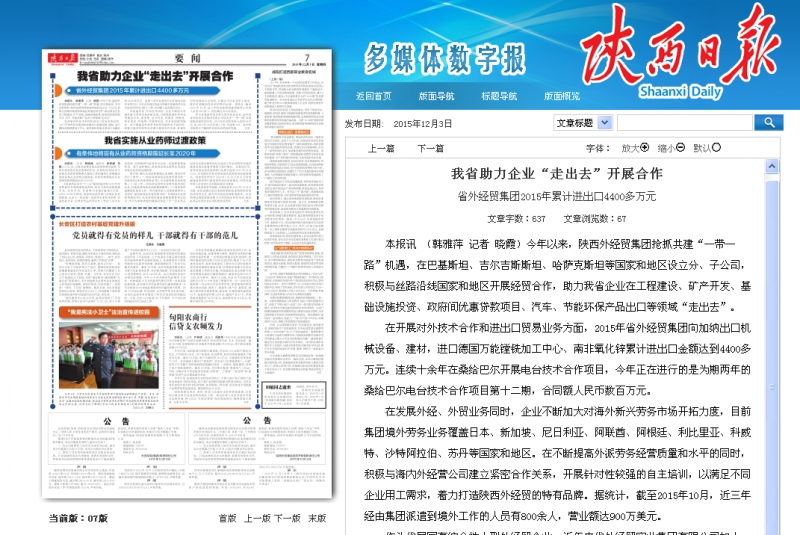 陜西日報刊登-----我省助力企業“走出去”開展合作