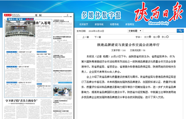 陜西日?qǐng)?bào)刊登---陜港品牌建設(shè)與質(zhì)量合作交流在港舉行