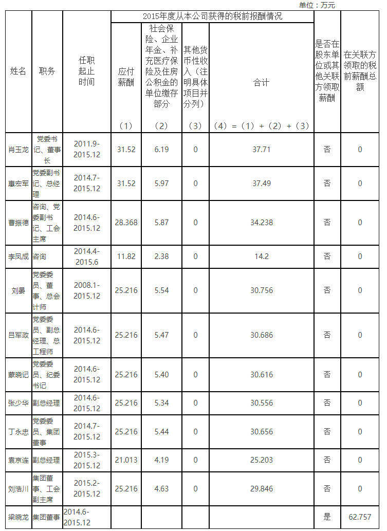 1.上表披露薪酬為我公司負責人2015年度全部應發稅前薪酬,按國家規定由單位繳存各種社會保險等。其中,第(1)項由國資委(薪酬審核部門)核定。