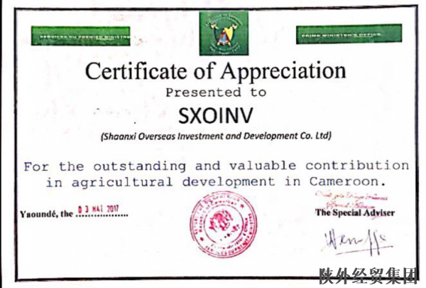 喜 報---陜海投援喀麥隆農業技術示范中心獲喀麥隆總理府頒發杰出貢獻獎